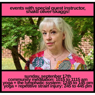 Special Guest Instructor Shakti River to provide Community Meditation, a workshop on Yoga + the Lymphatic System, and a workshop on Yoga + Repetitive Strain Injury.